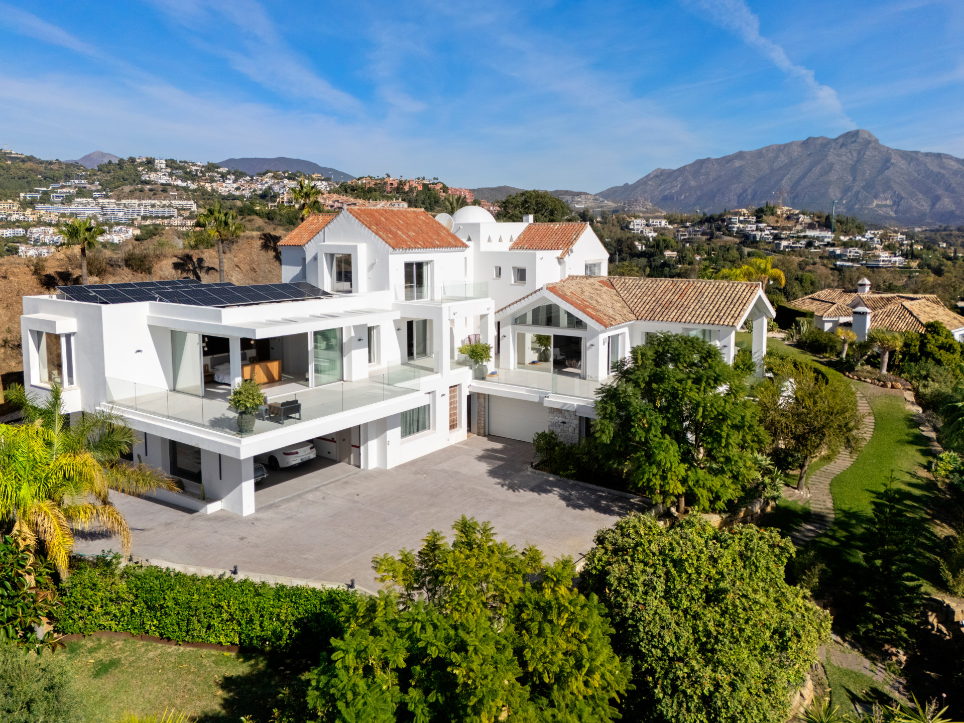 Perched on a privileged hillside in Puerto del Almendro, Benahavís, this south-facing villa features nine bedrooms with en-suite bathrooms across a main residence and an independent guest house. The property includes two outdoor swimming pools and offers panoramic sea and mountain views. The contemporary Mediterranean design emphasizes light-filled interiors, generous volumes, and seamless indoor-outdoor flow, with discreet access via a private driveway and ample parking.